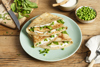 Pannenkoeken met creme fraiche, doperwten en verse kruiden